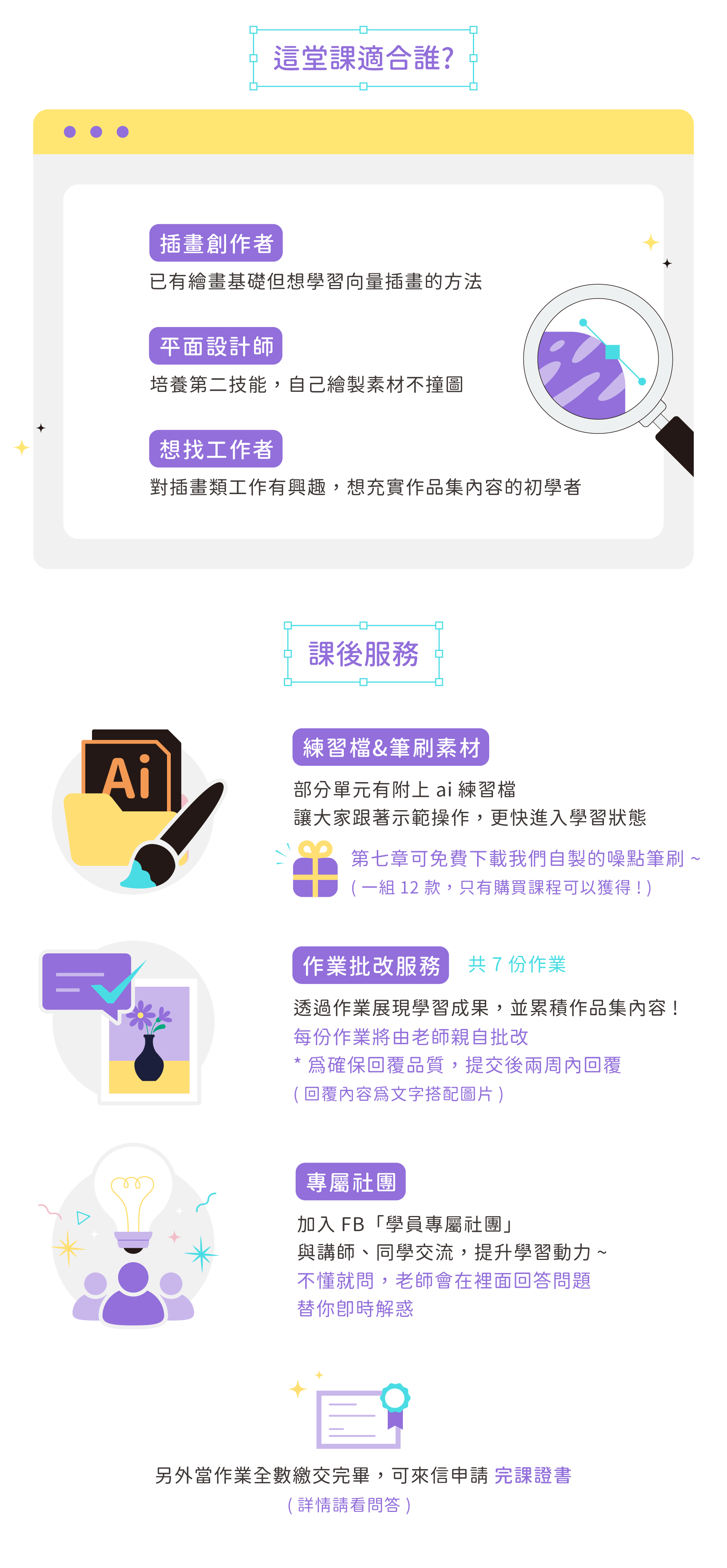 從淺入深,帶你探索 Illustrator 中各種實用工具,創作出多樣化風格的插畫! 無論你是初學者還是有一定基礎,這堂課都能夠滿足你的需求,讓插畫技能提升!