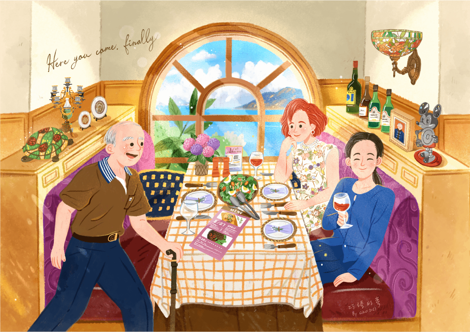 畫中描繪的是表姊的夢境,將天堂化身為一間美式餐廳,畫面裡的阿公與我們的其他家人在天上開心相聚,氣氛非常溫馨。我在這幅作品中加入了很多巧思和彩蛋,像是壁燈和各種擺飾,這些都是他們在世時所使用過的物品。還有,我特別放入了繡球花,因為繡球花象徵著團聚和幸福,無論我們有多長的離別,終會有再相聚的一天。