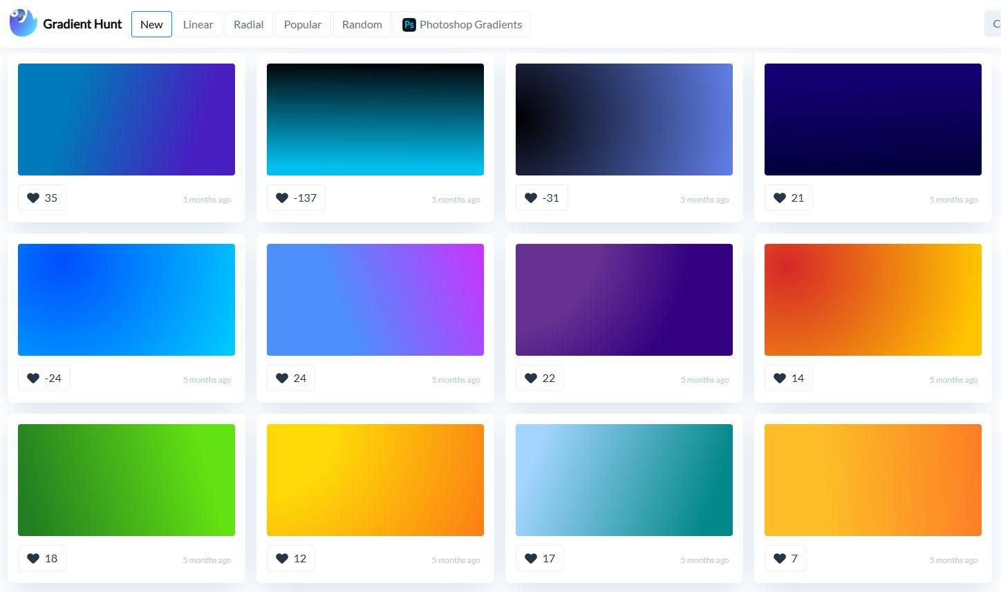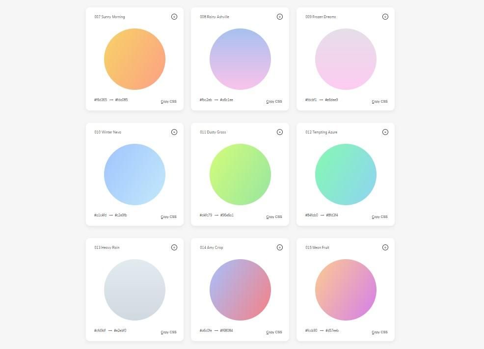 Gradient Hunt 是一個免費且公開的漸層色彩靈感平台,收集了許多由設計師手工製作的潮流漸層配色,以及使用者上傳的漸層配色。使用者可以瀏覽、選擇自己喜歡的漸層,並且複製 CSS 色碼 / 漸層設定 / 下載 PNG,用在網頁或設計稿裡。
