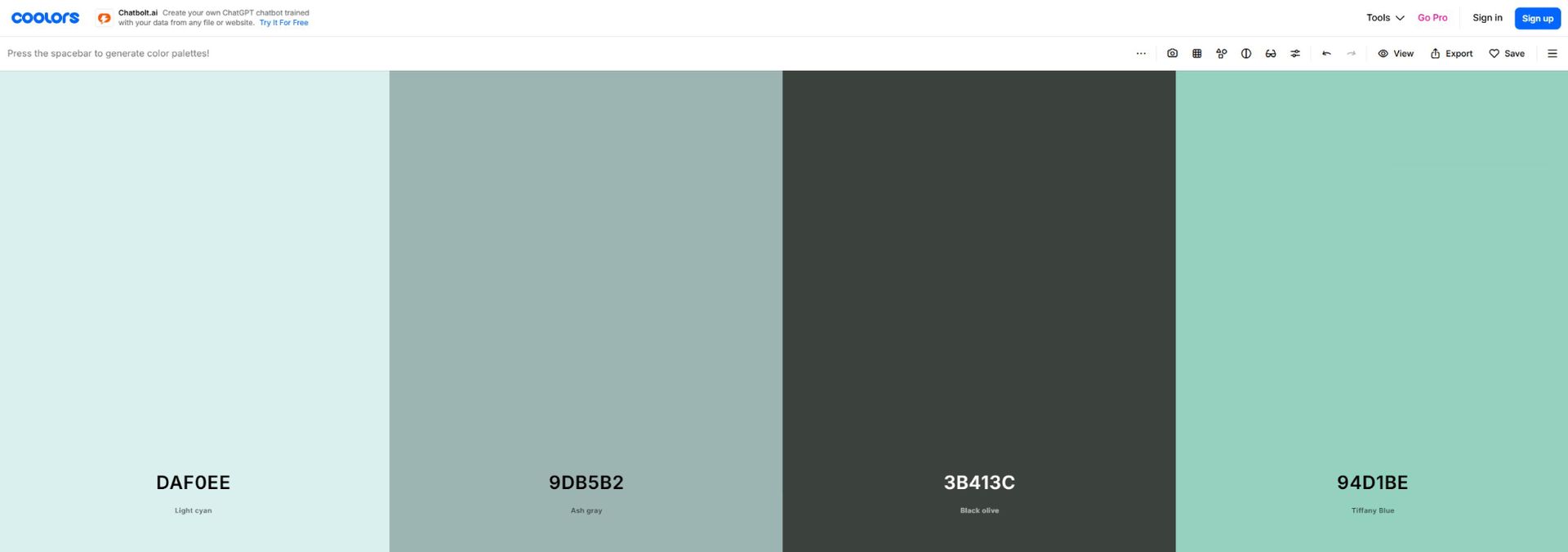 Coolors 是一款快速配色產生器,只要簡單點幾下,就能生出一套舒適的配色組合。我們也可以先鎖定幾個喜歡的顏色,直接按下空白鍵,就會生成其他尚未上鎖的顏色,也能直接手動微調每一個顏色 ( 如色相與對比 )。