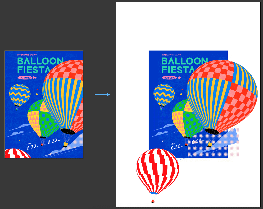 像是範例的熱氣球圖樣不做旋轉,但會位移,所以只要把它從海報的遮色片中釋放;而雲朵的形狀會變化,所以將圖樣色票展開後再將其從剪裁遮色片中釋放。