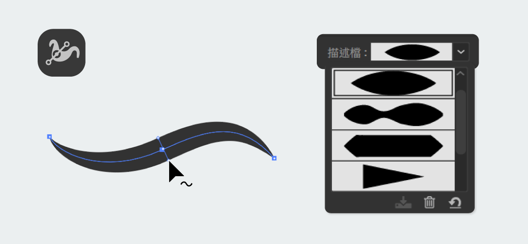 - 寬度描述檔 (Width Profile): 透過預設或自訂的描述檔,讓筆畫沿著路徑自動呈現粗細的漸變,例如兩端細中間粗,或從粗到細的變化。