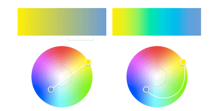 - 中間色調「髒掉」:當兩個飽和度很高的顏色做漸層時,中間的顏色可能會看起來灰灰髒髒的,使漸層看起來不自然。