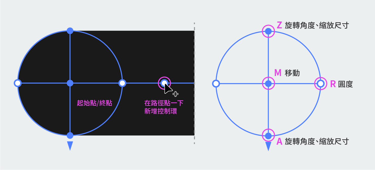 *選取多個控制環後,可同時編輯所有控制點 - 刪除控制環:點兩下 控制點M,起始點/終點無法刪除。