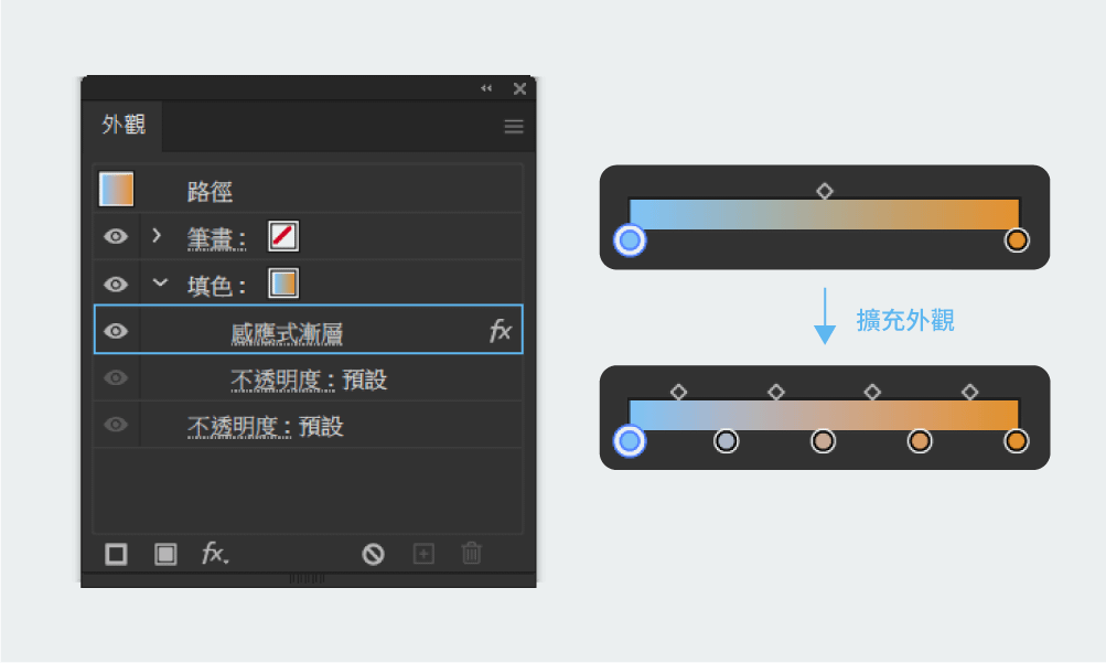 - 套用漸層效果後,漸層滑桿仍會顯示原始色標,方便你編輯顏色與漸層設定。當執行 「擴充外觀」 後,則可見到新增的色標。