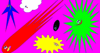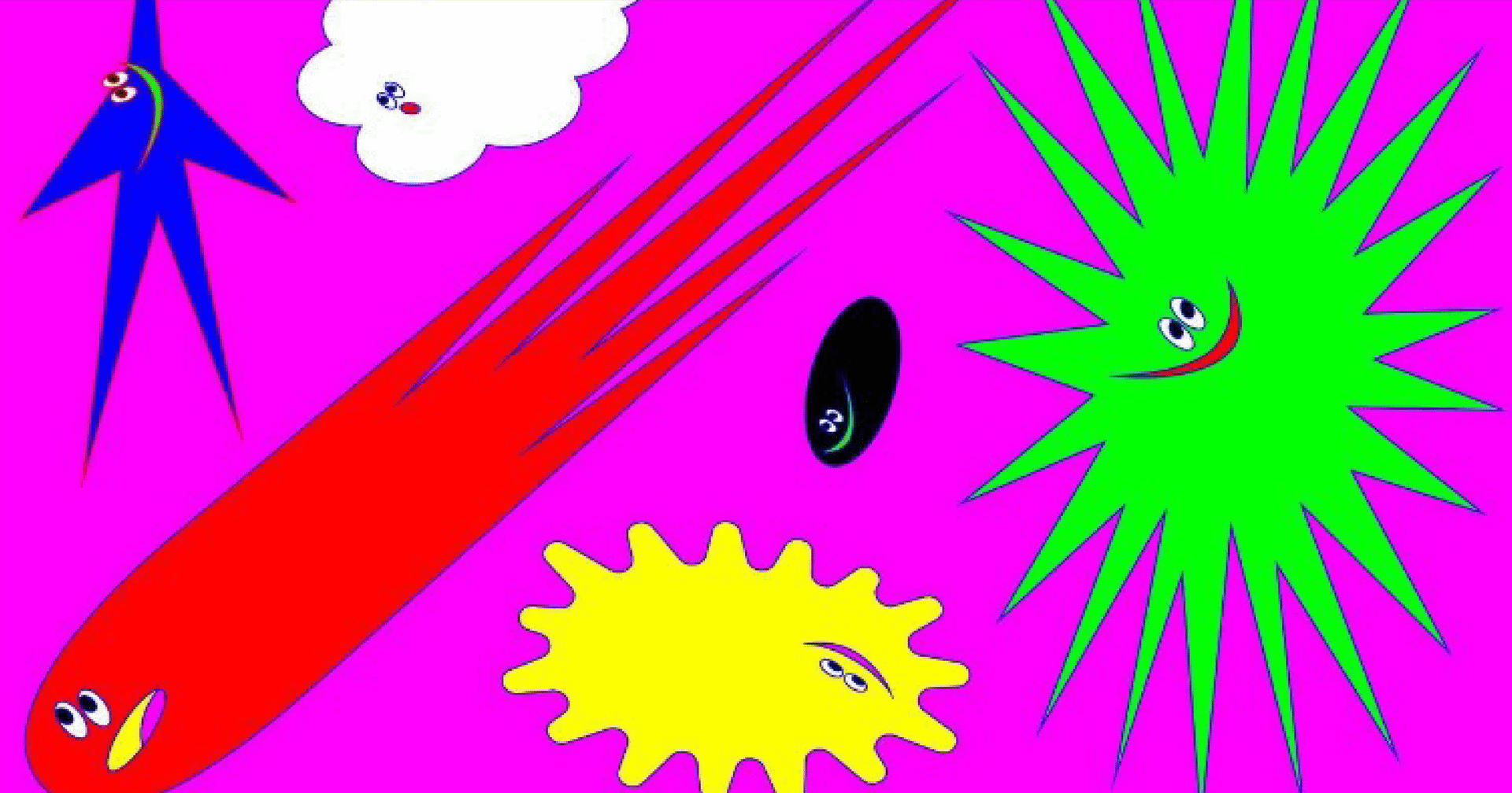 新醜風的色彩由高飽和高明度的紅、綠、黃、藍等做為主要色調,由這些色彩做為搭配或漸層色下去做變化,極具視覺張力。