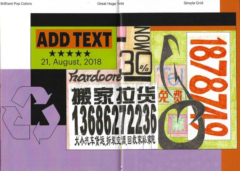 簡單的幾何圖形如圓形、矩形與三角形等都是常出現於新醜風的圖形,透過堆疊、重疊等拼湊出新的視覺效果,也會適時的加入一些手繪的插圖、標誌效果等,增加整體的豐富度。