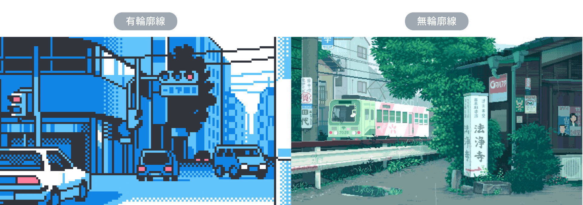 輪廓線能夠突顯物件的存在感,加強外圍輪廓,同時也會使整體呈現更加卡通化的感覺。相反地,如果沒有輪廓線,物件會更自然地融入周遭環境,增加畫面的寫實感。