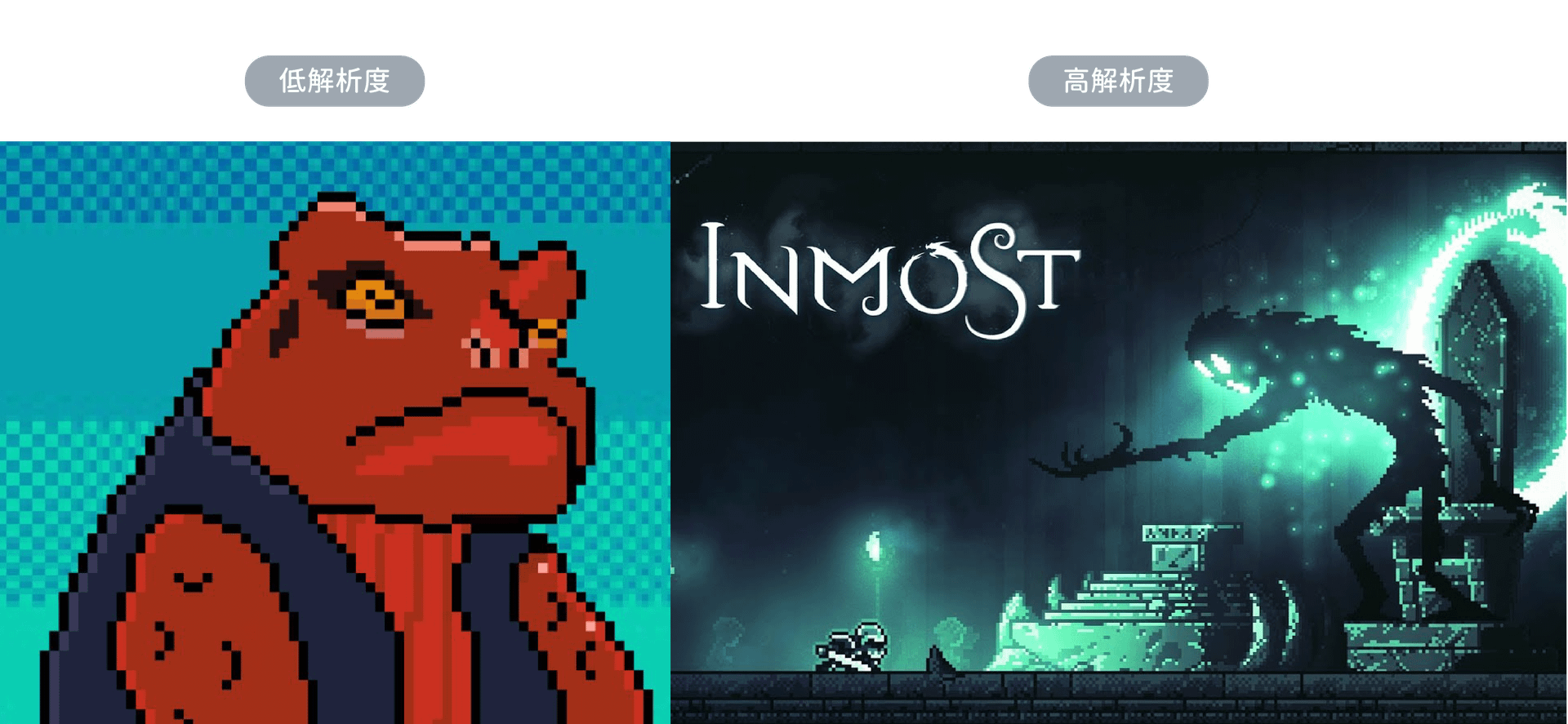 相反的,解析度越高所能顯示的像素數量就越多,圖像被簡化的程度低,所表現出來的像素風格就會更精緻更有真實感。