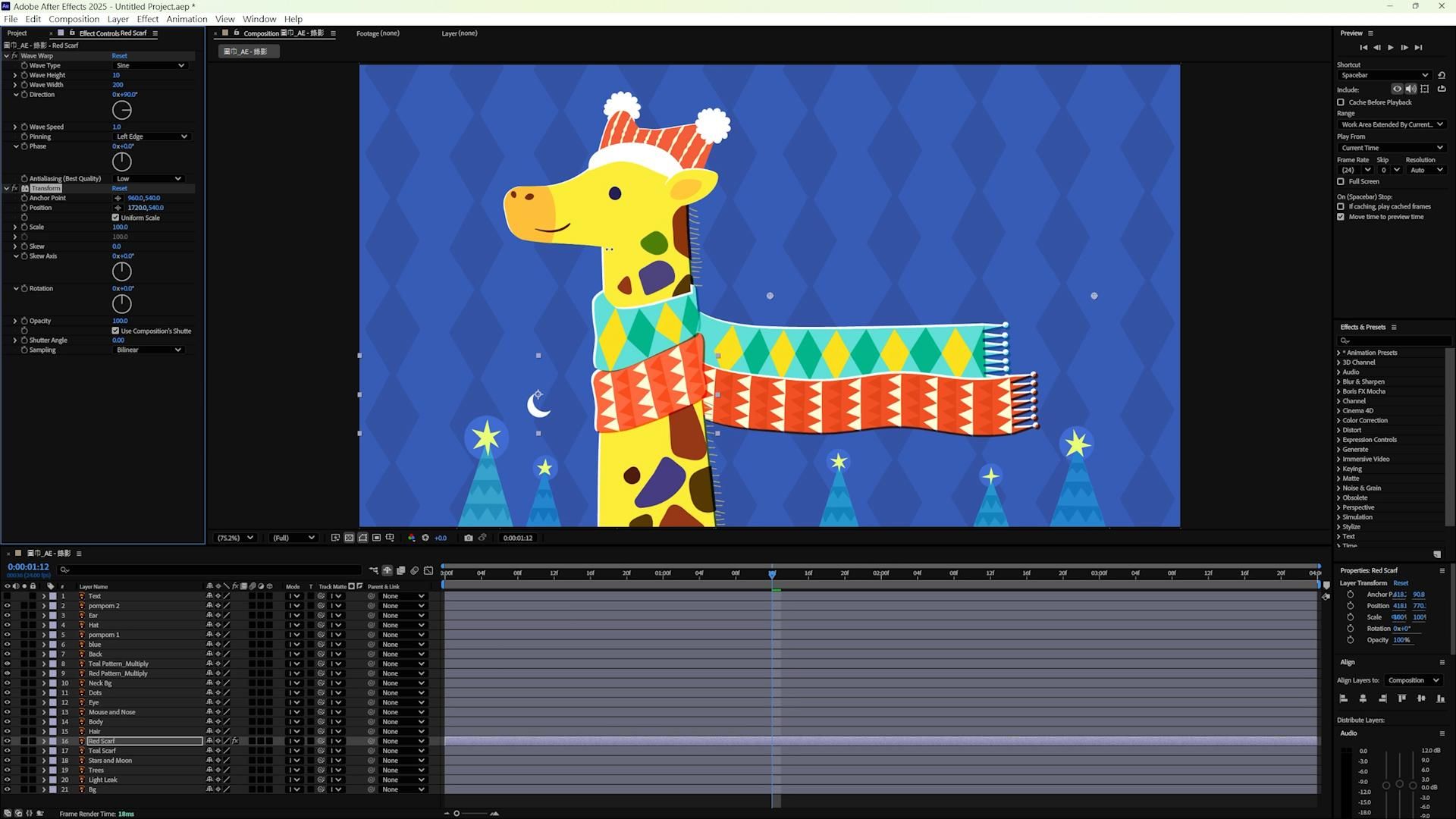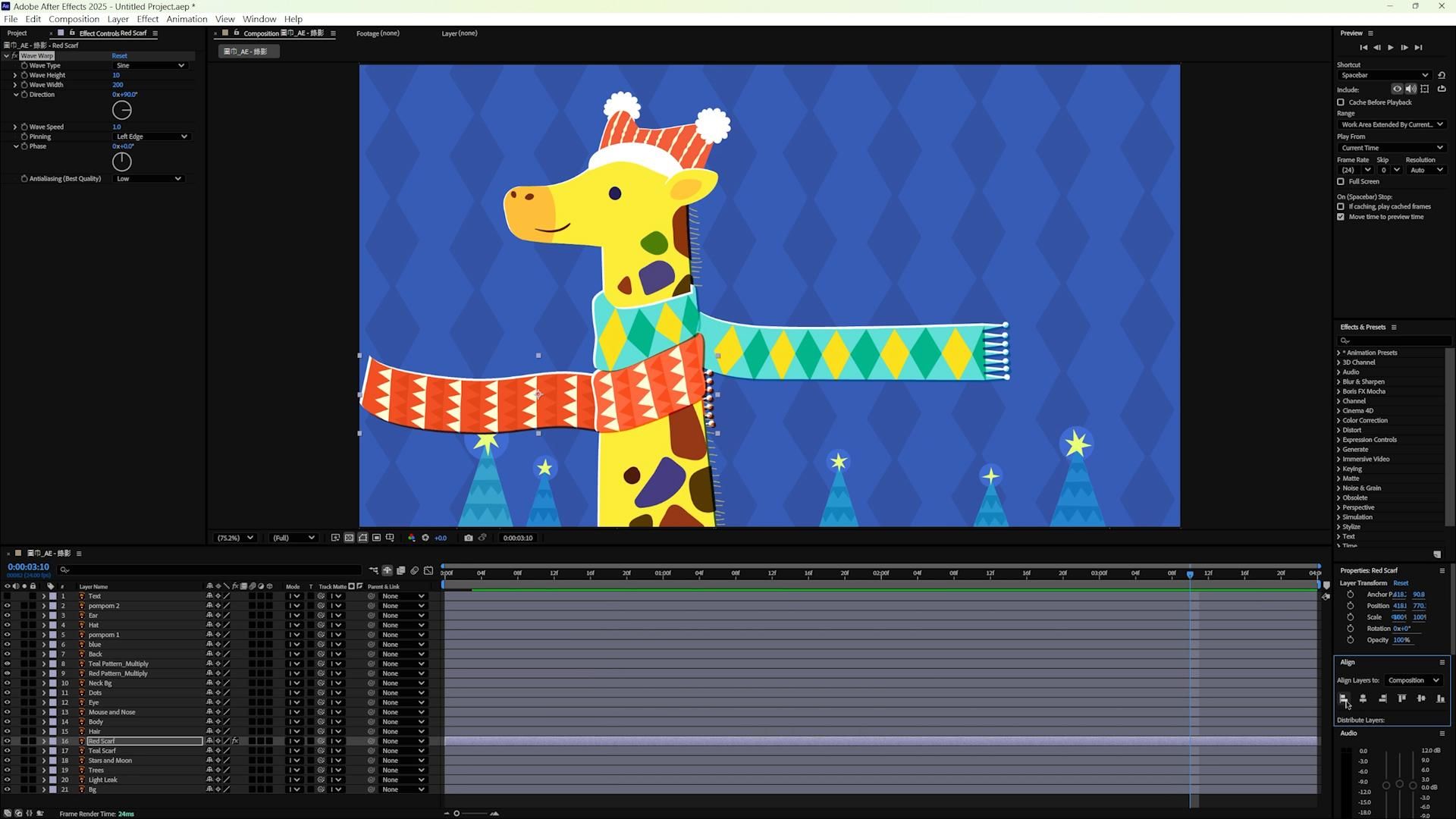 而動畫的構想是長頸鹿彎脖子時 圍巾、鬃毛、絨球等處會隨風飄動,由於會將整隻長頸鹿做預合成*,因此需先將物件透明度平面化,以維持混合模式呈現的樣式。