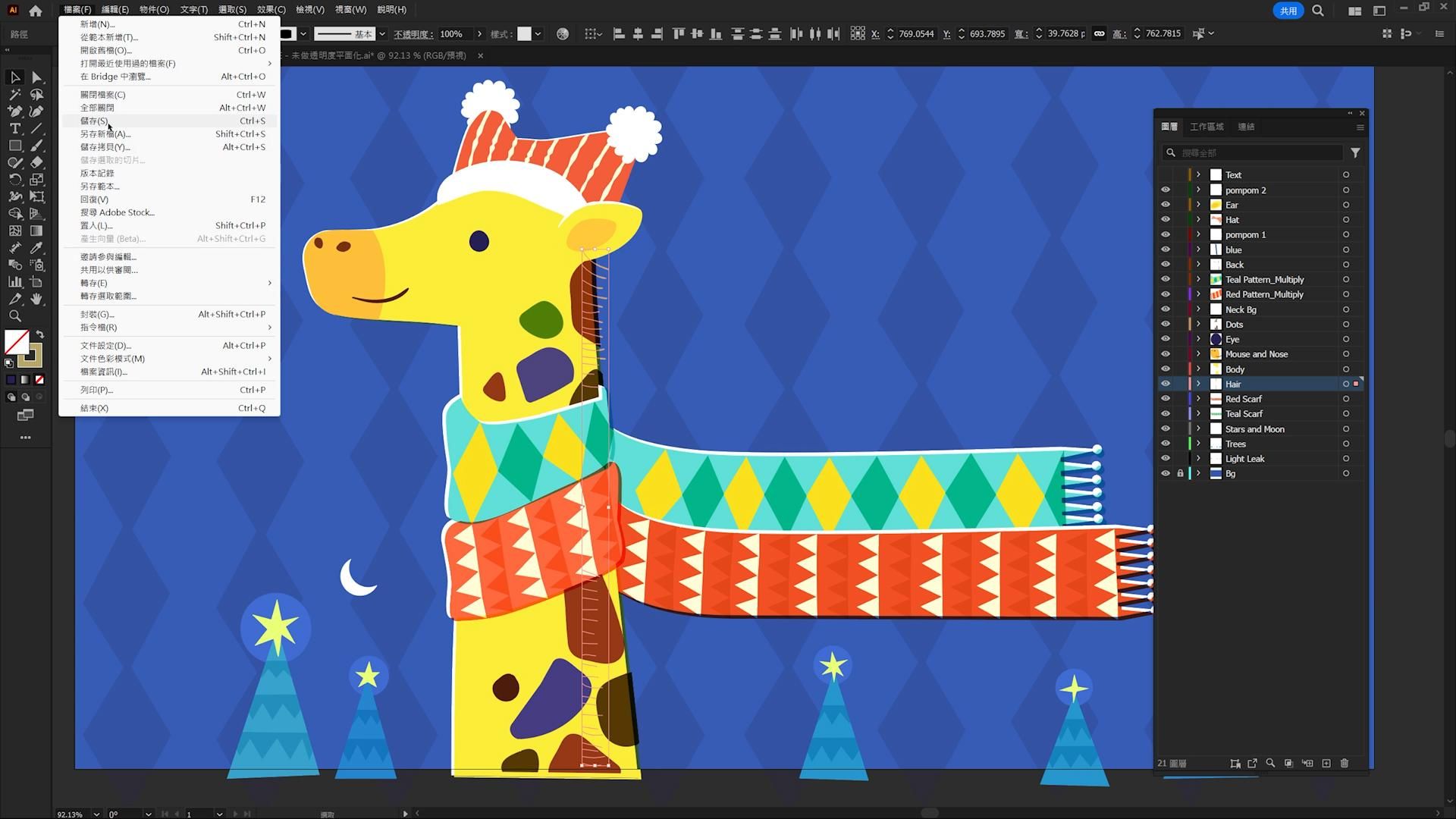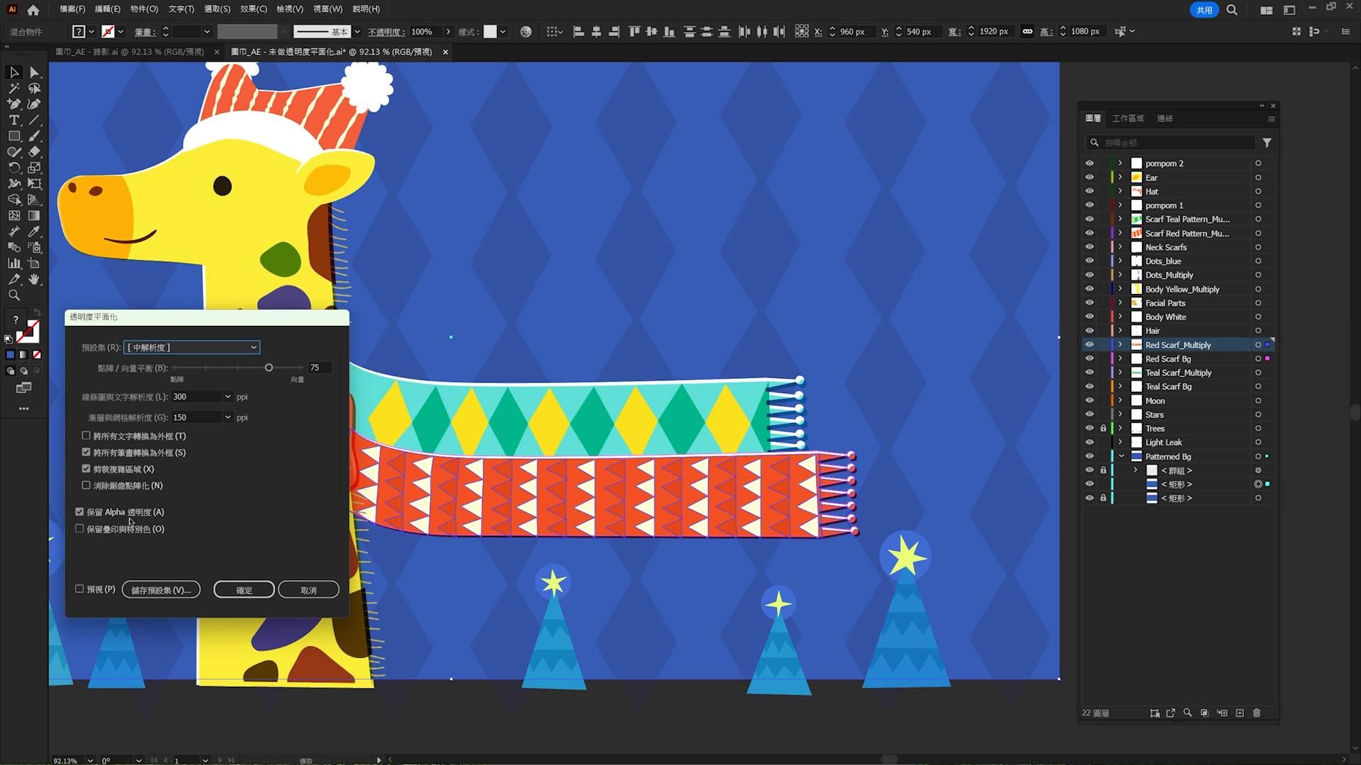 選取圍巾、圍巾下層色塊及背景,到 物件>透明度平面化 記得勾選「保留 Alpha 透明度」,可按預視預覽效果